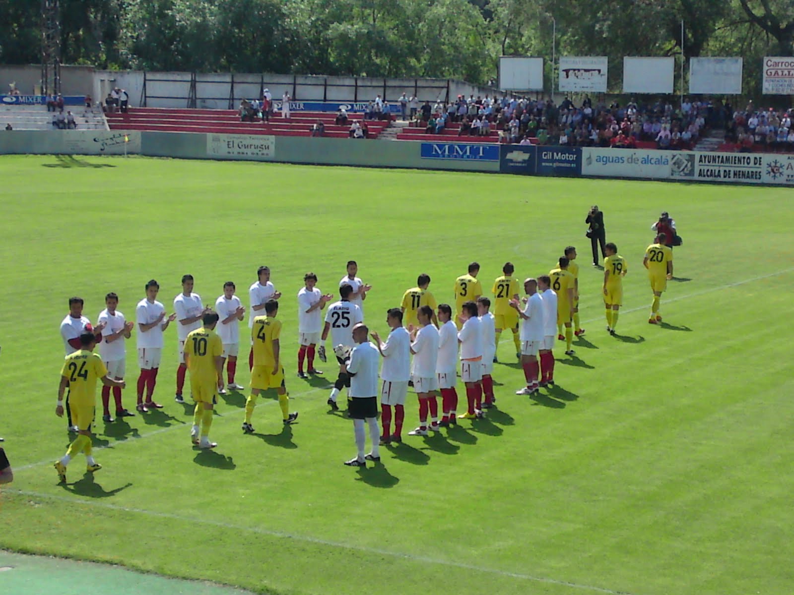 La imagen corresponde al momento de la salida del Alcorcón al terreno de juego ya como campeón de este grupo II de la Segunda División B, por lo que recibe el homenaje de los jugadores rojillos con el clásico pasillo. Por cierto, los jugadores del Alcalá llevan camisetas blancas con la frase: “NECESITAMOS COBRAR”. Ya van para 5 meses…